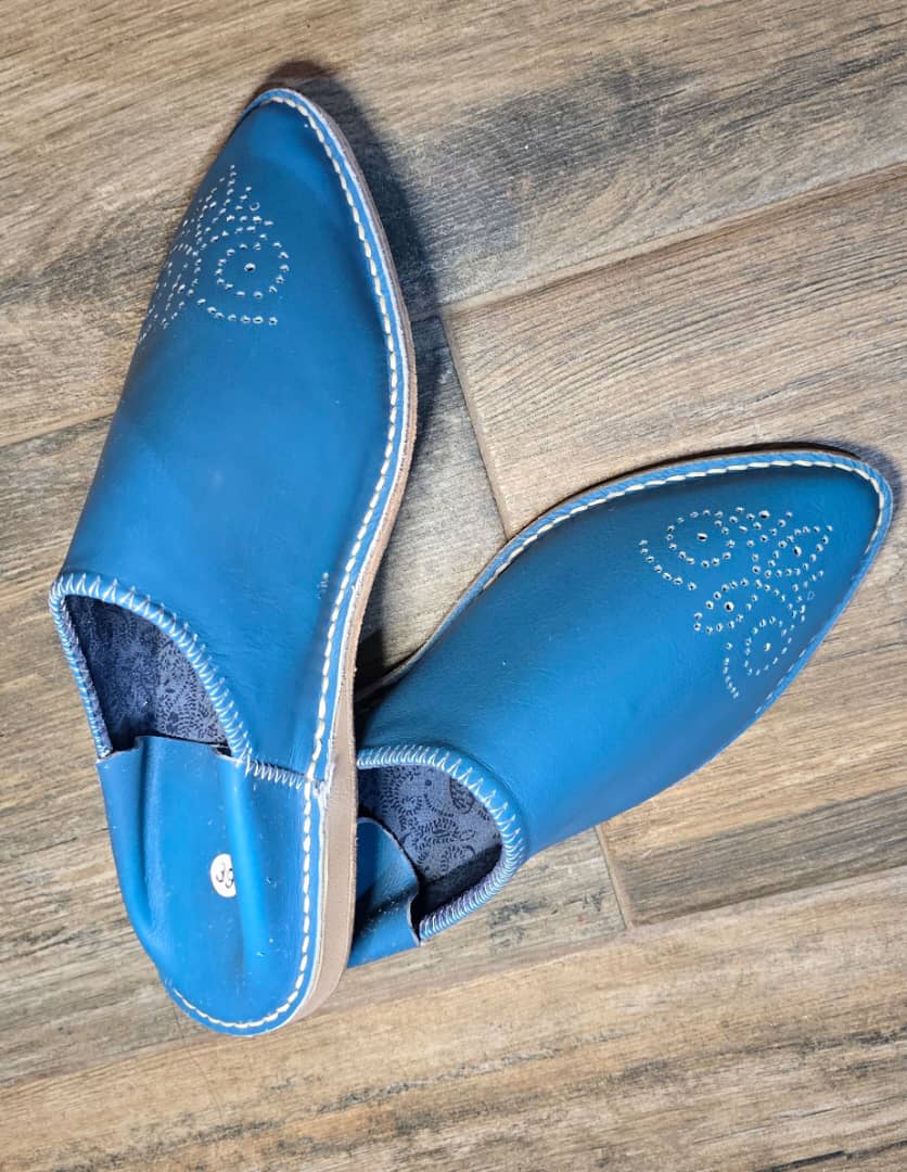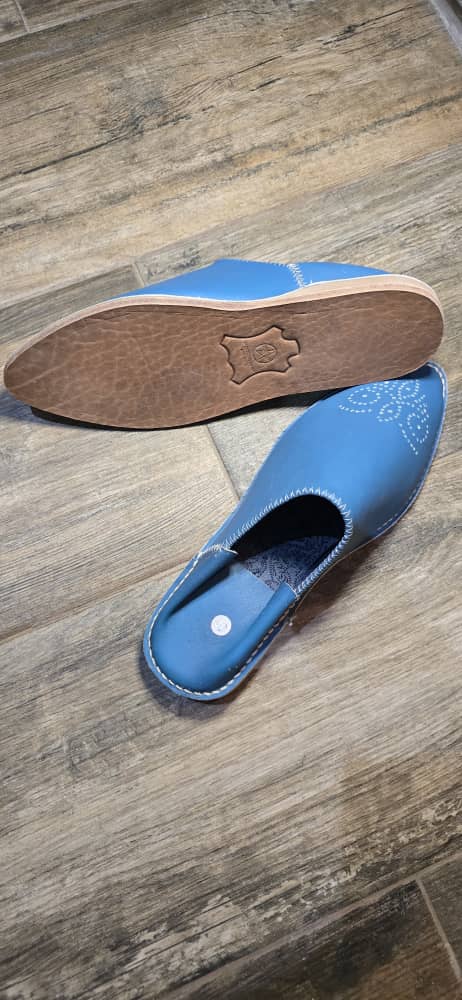 Babouche artisanale en cuir de couleur bleu ciel.